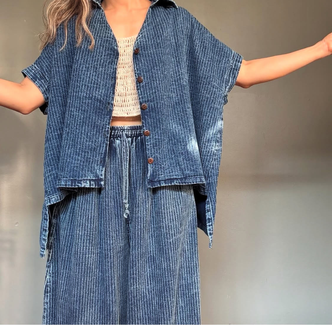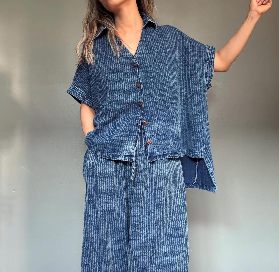 Ballongbyxor i stentvättad bomull, handsydda och naturfärgade med Indigo. De har en avslappnad passform med ett elastiskt midjesband för högsta komfort.