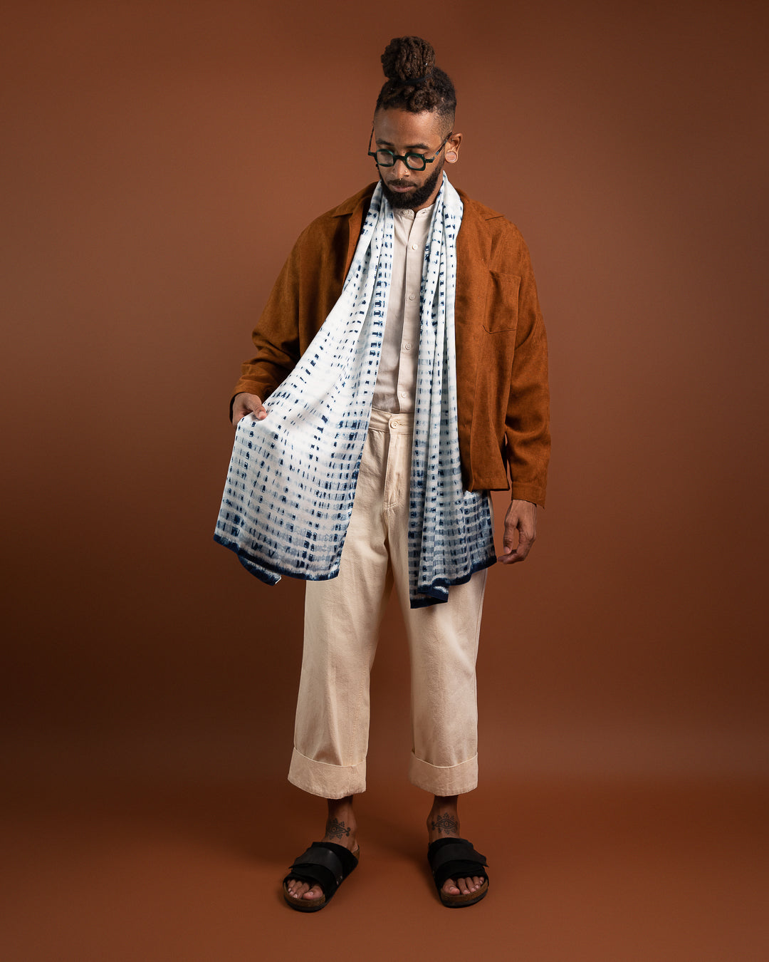 Upplev lyxen i 100% siden, ett material som skimrar mjukt och faller med elegant lätthet. Varje scarf är shiborifärgad med äkta indigo, vilket skapar levande, organiska mönster – inget exemplar är det andra likt.