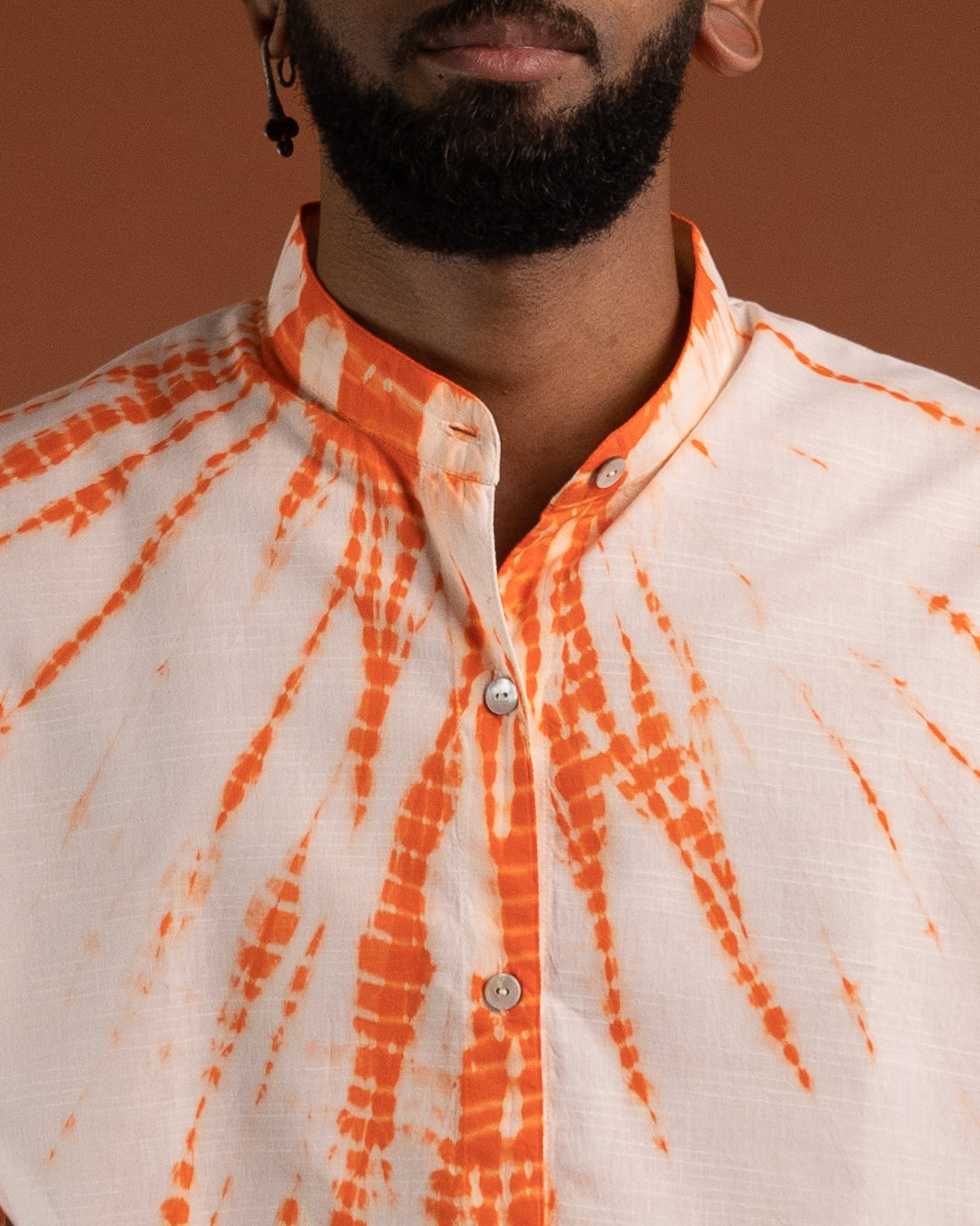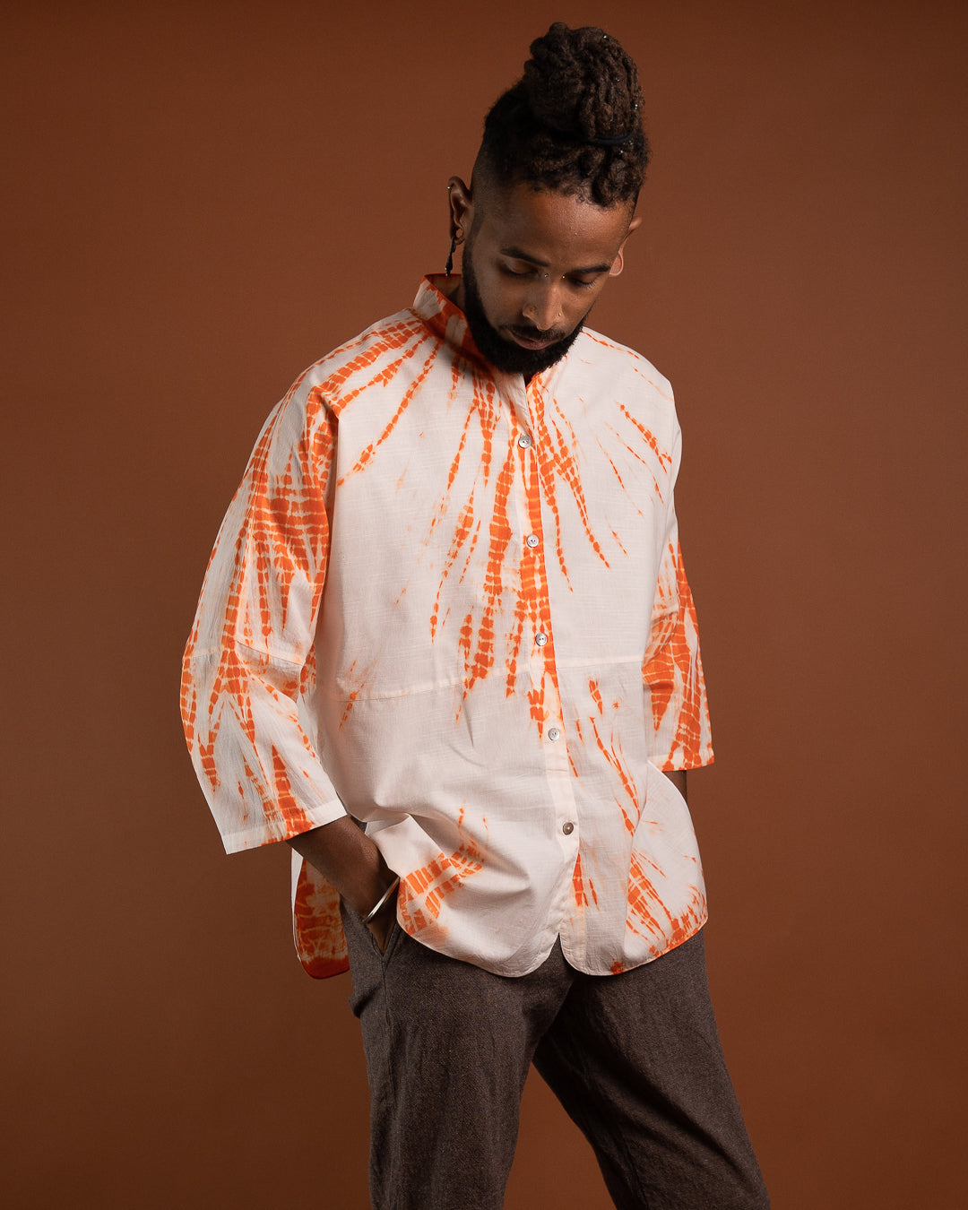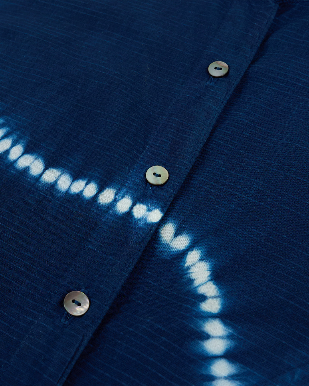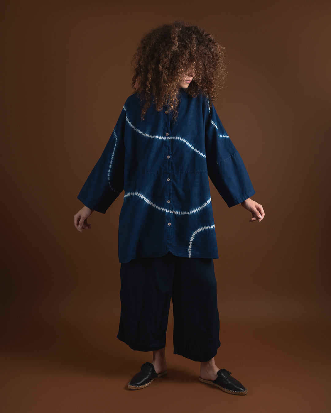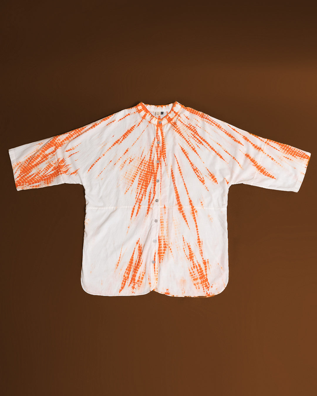 Upptäck en skjorta som kombinerar tidlös elegans med genuint hantverk. Den klassiska mandarinkragen ger ett rent och sofistikerat uttryck, medan den handfärgade designen – skapad med den traditionella shibori-metoden – gör varje plagg unikt. Färgerna appliceras med giftfria pigment, vilket gör skjortan till ett skonsamt och hållbart val.