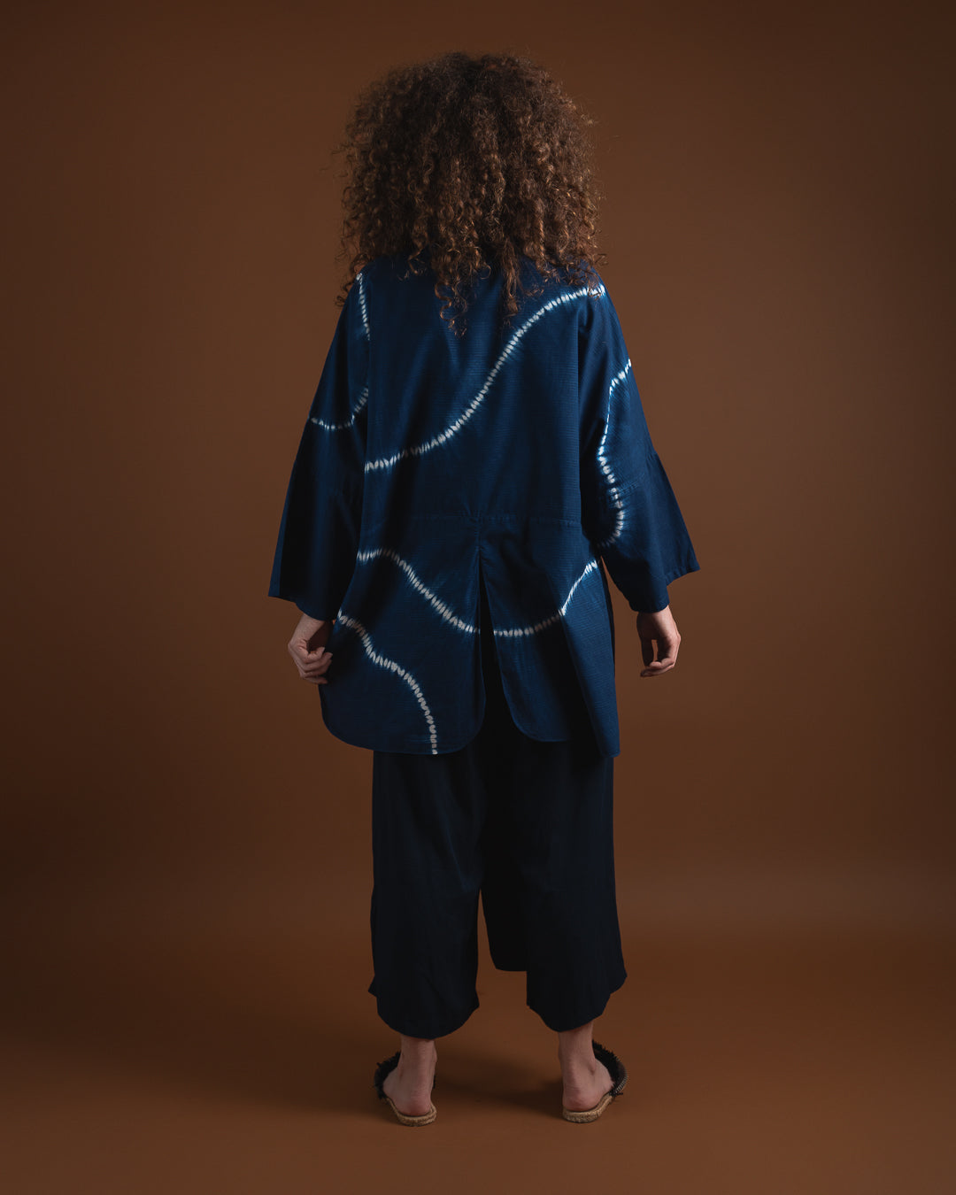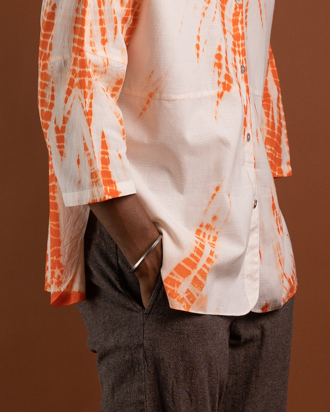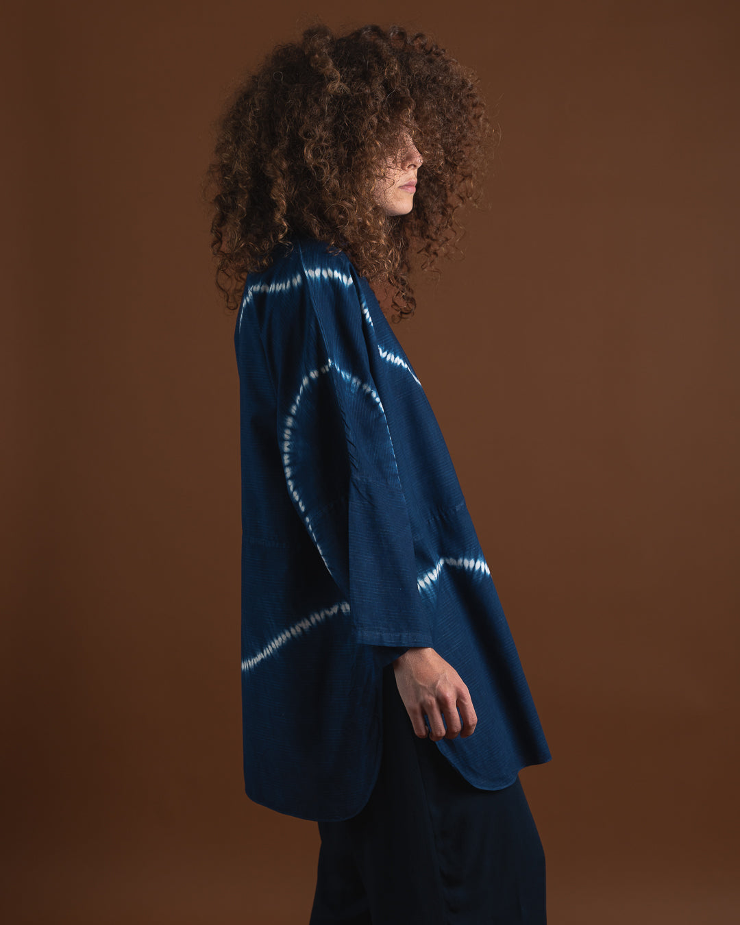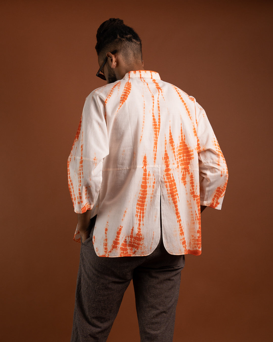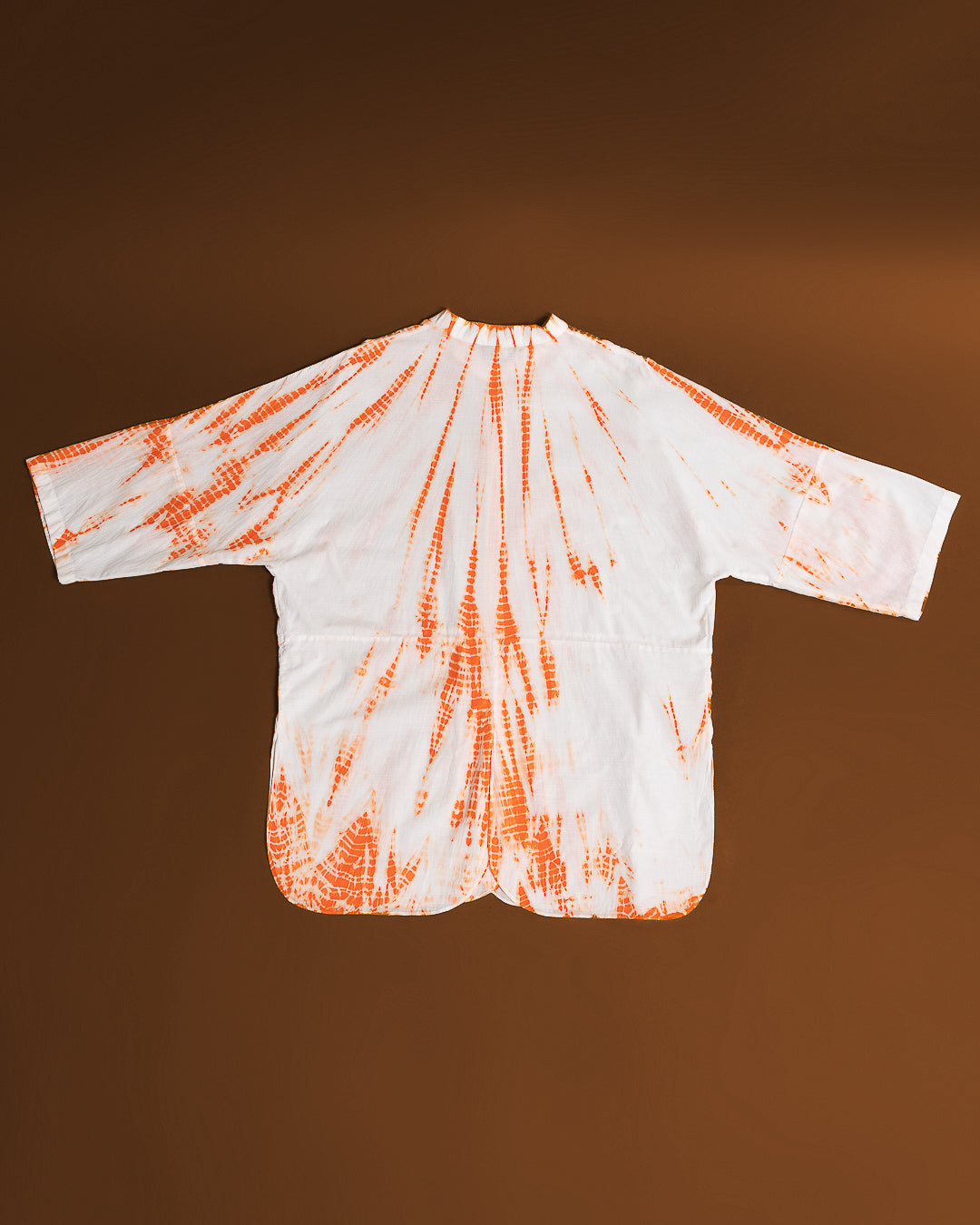 Upptäck en skjorta som kombinerar tidlös elegans med genuint hantverk. Den klassiska mandarinkragen ger ett rent och sofistikerat uttryck, medan den handfärgade designen – skapad med den traditionella shibori-metoden – gör varje plagg unikt. Färgerna appliceras med giftfria pigment, vilket gör skjortan till ett skonsamt och hållbart val.