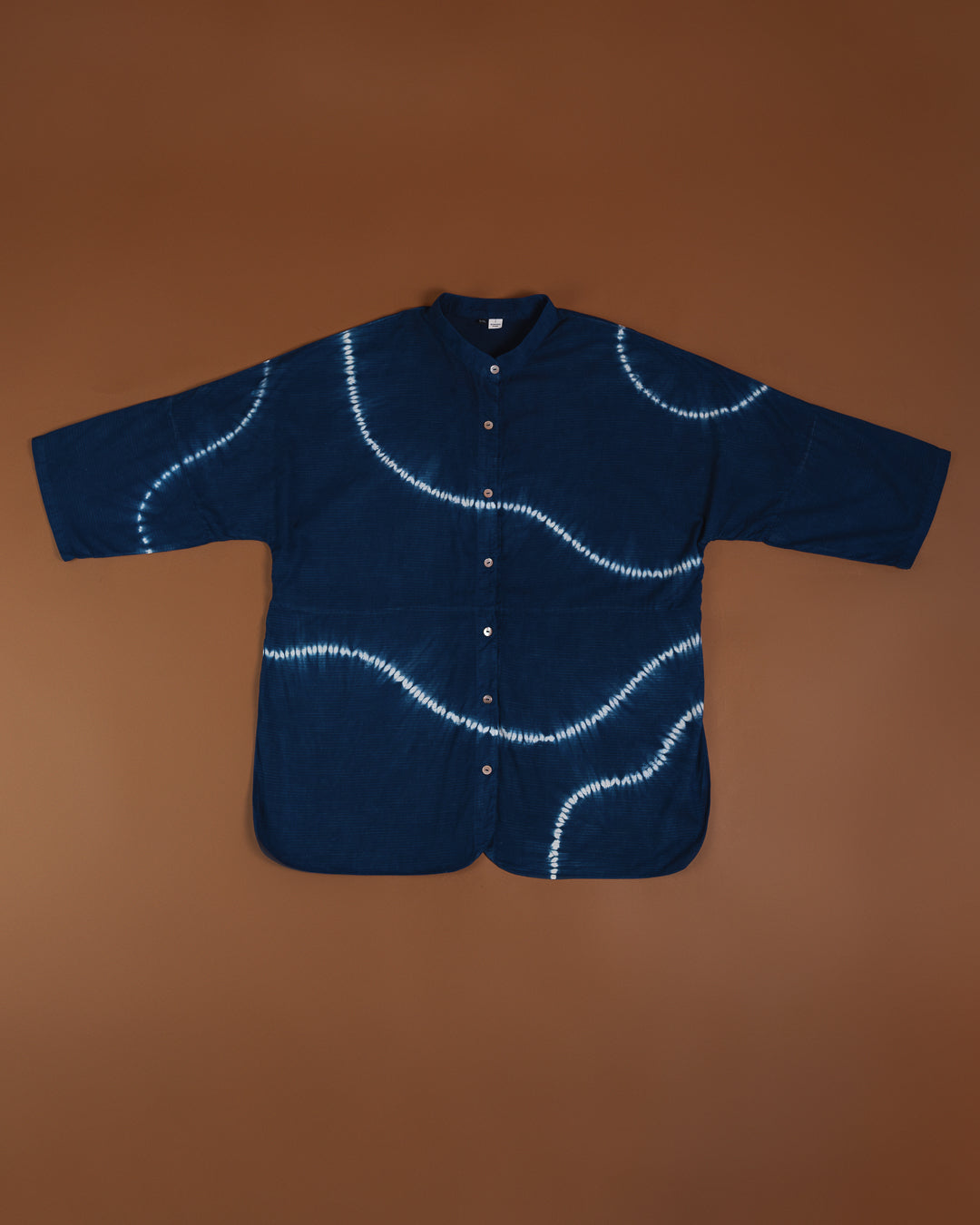 Unisex långärmad skjorta med mandarinkrage – handfärgad med shibori-teknik